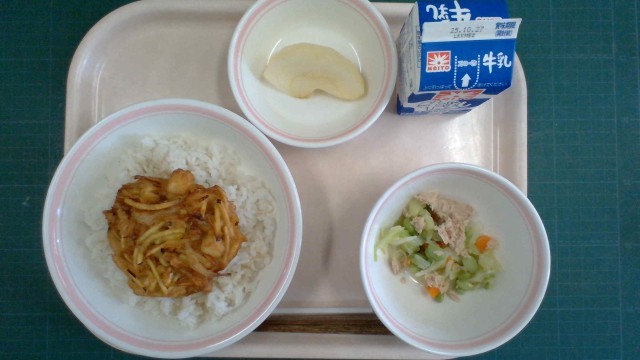 〈今日の給食〉10月20日(月) 公開日 2025/10/21 更新日 2025/10/21 給食だより かき揚げ丼、ツナと枝豆のサラダ、りんご、牛乳〈産地〉いか:ペルーさくらえび:台湾たまご:群馬県さつまいも:千葉県にんじん:北海道たまねぎ:北海道キャベツ:長野県りんご:長野県えだまめ:北海道