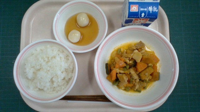 ごはん、くりとかぼちゃの煮物、月見団子、牛乳