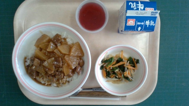 牛バラ肉と大根のあんかけごはん、野菜の中華和え、ぶどうゼリー、牛乳