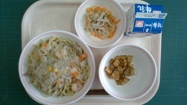 ちゃんぽん麺、お好み揚げじゃが、切干大根のナムル、牛乳