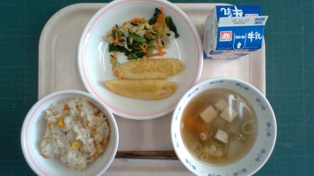 ツナごはん、笹かまのカレー揚げ、白菜のおかか和え、牛乳