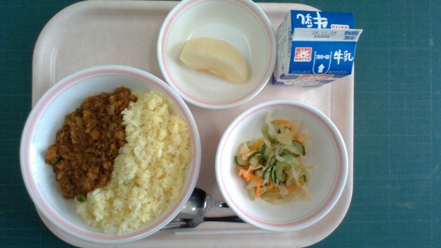 ごぼうのドライカレー、イタリアンドレッシングサラダ、りんご、牛乳