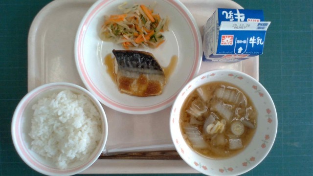 ごはん、さばのおろしダレ、きゅうりともやしの甘酢和え、根菜と鶏肉のみそ汁、牛乳