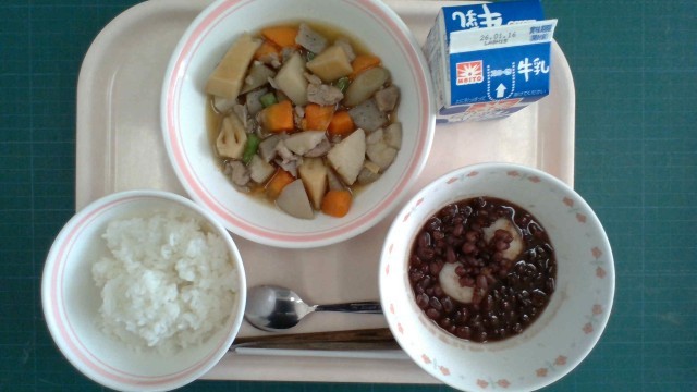 〈今日の給食〉1月9日(金) 公開日 2026/01/15 更新日 2026/01/15 給食だより ごはん、筑前煮、白玉汁粉、牛乳〈産地〉とりにく:宮崎県たけのこ:香川県、愛媛県、徳島県にんじん:千葉県ごぼう:青森県れんこん:千葉県さといも:埼玉県いんげん:沖縄県あずき:北海道しらたまこ:千葉県、茨城県