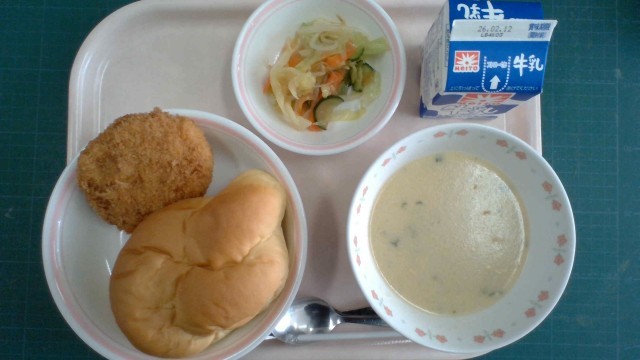 パンプキンパン、ツナカレーコロッケ、玉ねぎドレッシングサラダ、コーンポタージュ、牛乳