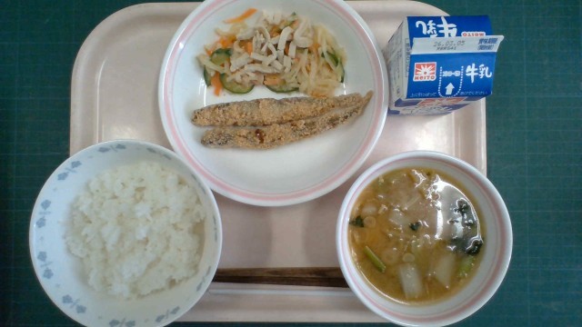 ごはん、ししゃものおかき揚げ、切干大根の和え物、生揚げのみそ汁、牛乳