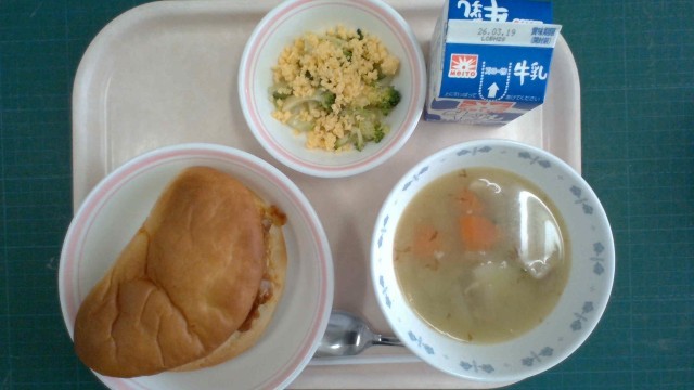 ピザサンド、ミモザサラダ、野菜のスープ煮、牛乳