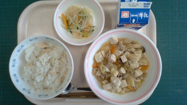 〈今日の給食〉3月19日(木) 公開日 2026/03/23 更新日 2026/03/23 給食だより 鮭ごはん、五目豆腐、春雨の和え物、牛乳〈産地〉ぶたにく:埼玉県、群馬県さけ:北海道たけのこ:香川県、愛媛県、徳島県しょうが:高知県たまねぎ:北海道にんじん:徳島県しめじ:長野県ねぎ:千葉県もやし:栃木県きゅうり:群馬県