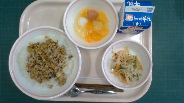 高菜そぼろ丼、きゅうりともやしの甘酢和え、紅白白玉ポンチ、牛乳