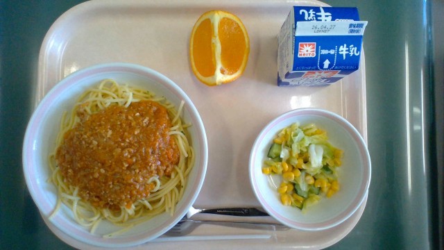 スパゲティミートソース、コーンサラダ、清見オレンジ、牛乳