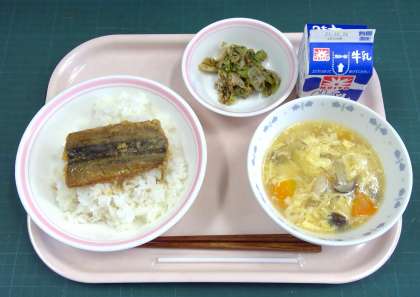 秋刀魚のかば焼き丼、かきたま汁、キャベツの赤しそ和え、牛乳