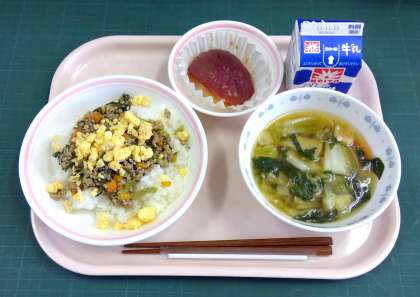 高菜そぼろ丼、中華スープ、焼きりんご、牛乳