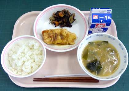 ご飯、鶏天のごまだれがけ、ひじきと根菜の土佐煮、わかめの味噌汁、牛乳