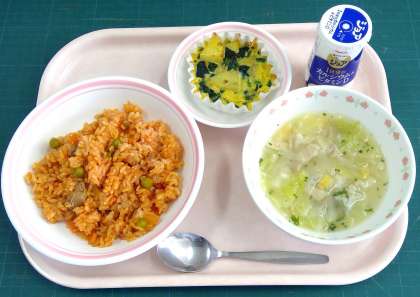 チキンライス、マカロニスープ、野菜の卵焼き、牛乳