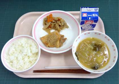 ご飯、鶏肉の香味焼き、れんこんのきんぴら、じゃがいもの味噌汁、牛乳