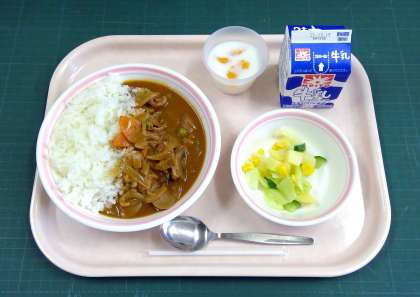 〈今日の給食〉12月8日(水) 公開日 2021/12/09 更新日 2021/12/09 給食だより ハヤシライス、マセドアンサラダ、みかん牛乳寒天、牛乳 〈産地〉 ぶたにく:群馬県 にんにく:青森県 たまねぎ、じゃがいも:北海道 にんじん:千葉県 キャベツ:愛知県 きゅうり:埼玉県