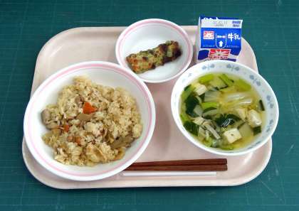 五目豆ご飯、白菜のすまし汁、ちくわの磯辺揚げ、牛乳