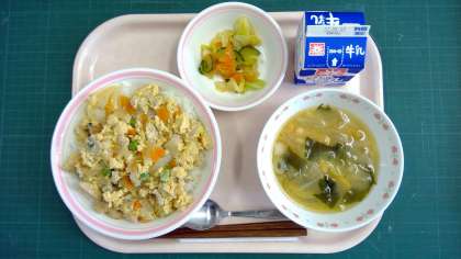 親子丼、野菜のみそ汁、キャベツの甘酢和え、牛乳