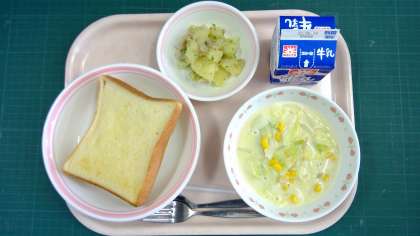 〈今日の給食〉6月7日(火) 公開日 2022/06/08 更新日 2022/06/08 給食だより レモンバタートースト、キャベツとコーンのクリームスープ、ジャーマンポテト、牛乳 〈産地〉 たまねぎ:佐賀県 にんじん、キャベツ、パセリ:千葉県 じゃがいも:長崎県