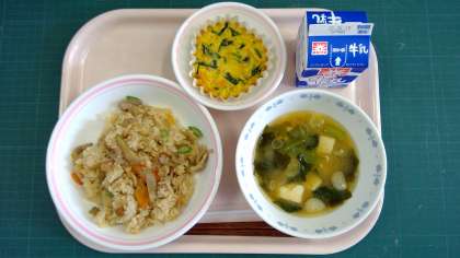 五目豆ごはん、野菜の卵焼き、わかめと豆腐のみそ汁、牛乳