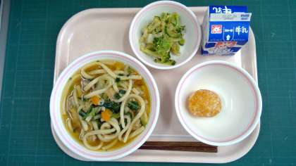 五目うどん、じゃがまるくん、ごまドレッシングサラダ、牛乳