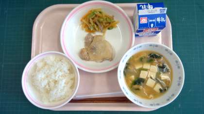 ご飯、とりの塩こうじ焼き、じゃが芋のきんぴら、豆腐と青菜のみそ汁、牛乳