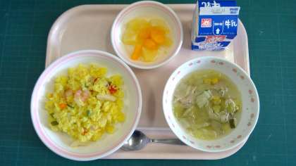 シーフードピラフ、夏野菜のスープ、フルーツポンチ、牛乳