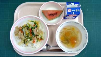 元気もりもりどん、じゅんさいとトマトの吸い物風、すいか、牛乳