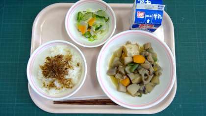 ご飯、かつお節のふりかけ、がめ煮、浅漬け、牛乳