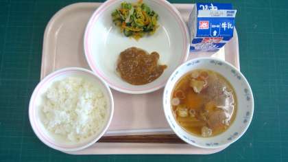 ご飯、鶏のごまみそだれ、菊入ちぐさ和え、お月見汁、牛乳