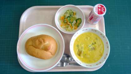 パン、かぼちゃグラタン、野菜のイタリアンドレッシングかけ、ジョア