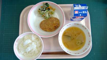 ご飯、肉じゃがコロッケ、おひたし、大根とわかめのみそ汁、牛乳