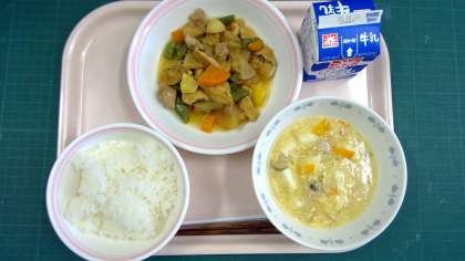 ご飯、栗と大根の煮物、かきたま汁、牛乳