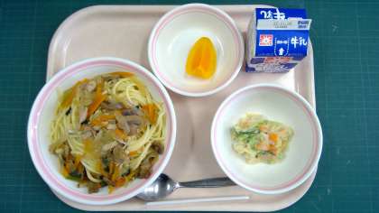 きのこのスパゲッティ、ツナマヨサラダ、柿、牛乳