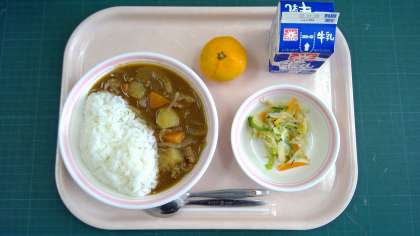 アッチのカレーライス、なんでもせん切りサラダ、みかん、牛乳