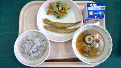ゆかりご飯、ししゃものピリ辛揚げ、やおはちのおでん、青菜のごまみそ和え、牛乳