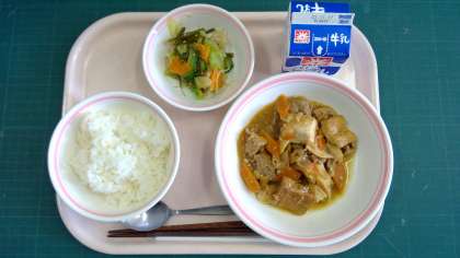 ご飯、ジャーチャンどうふ、もやしと茎わかめのサラダ、牛乳