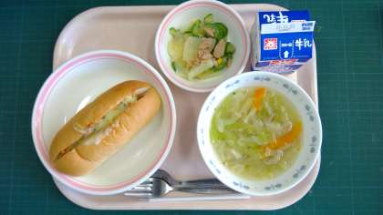〈今日の給食〉11月25日(金) 公開日 2022/11/25 更新日 2022/11/25 給食だより チリビーンズドッグ、キャベツベーコンのスープ、さっぱりポテトサラダ、牛乳 〈産地〉 ぶたにく:茨城県 たまねぎ、じゃがいも:北海道 にんじん、パセリ:千葉県 キャベツ:愛知県 きゅうり:群馬県
