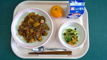 マーボーじゃが丼、野菜のごま醤油かけ、みかん、牛乳