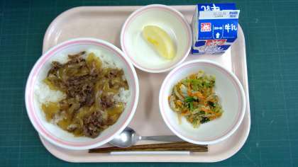 ワンダフル牛丼、キャベツのゆかり和え、りんご、牛乳