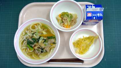 煮込みうどん、きすの天ぷら、和風ポテトサラダ、牛乳