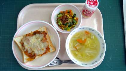 ピザトースト、ポトフ、カリカリベーコンのサラダ、牛乳