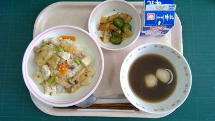 豆腐のうま煮丼、かぶときゅうりの土佐漬け、白玉汁粉、牛乳