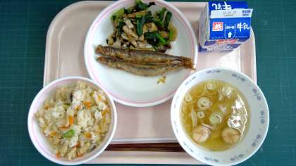 高野豆腐ご飯、ししゃものゆかり揚げ、小松菜の煮びたし、ゆばのお吸い物、牛乳