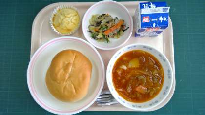 ミルクパン、トマト風ボルシチ、白菜のごま酢サラダ、カップケーキ、牛乳