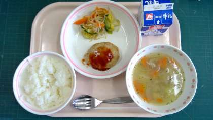 ごはん、ハンバーグ、オニオンドレッシングサラダ、ABCスープ、牛乳