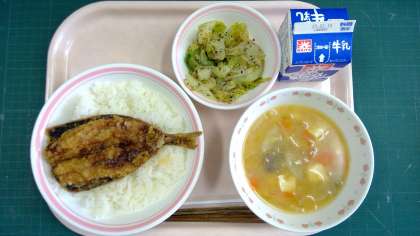 いわしのかばやき丼、呉汁、キャベツときゅうりの赤しそ和え、牛乳