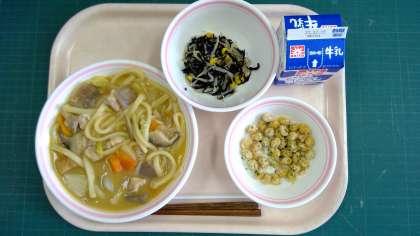 みそ煮込みうどん、青のりビーンズ、ひじきサラダ、牛乳