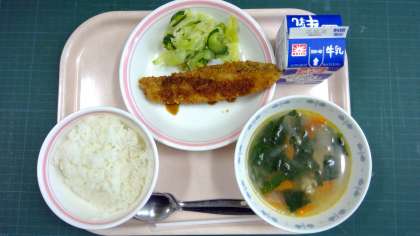 ご飯、鮭フライ、グリーンサラダ、イタリアンスープ、牛乳