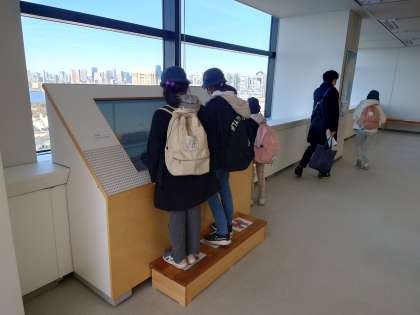 青海にあるミナトリエに到着しました。ミナトリエは地上100mから東京臨海部を望む眺望を活かし、東京港や臨海副都心の歴史、現在の姿、未来をご紹介する展示室です。